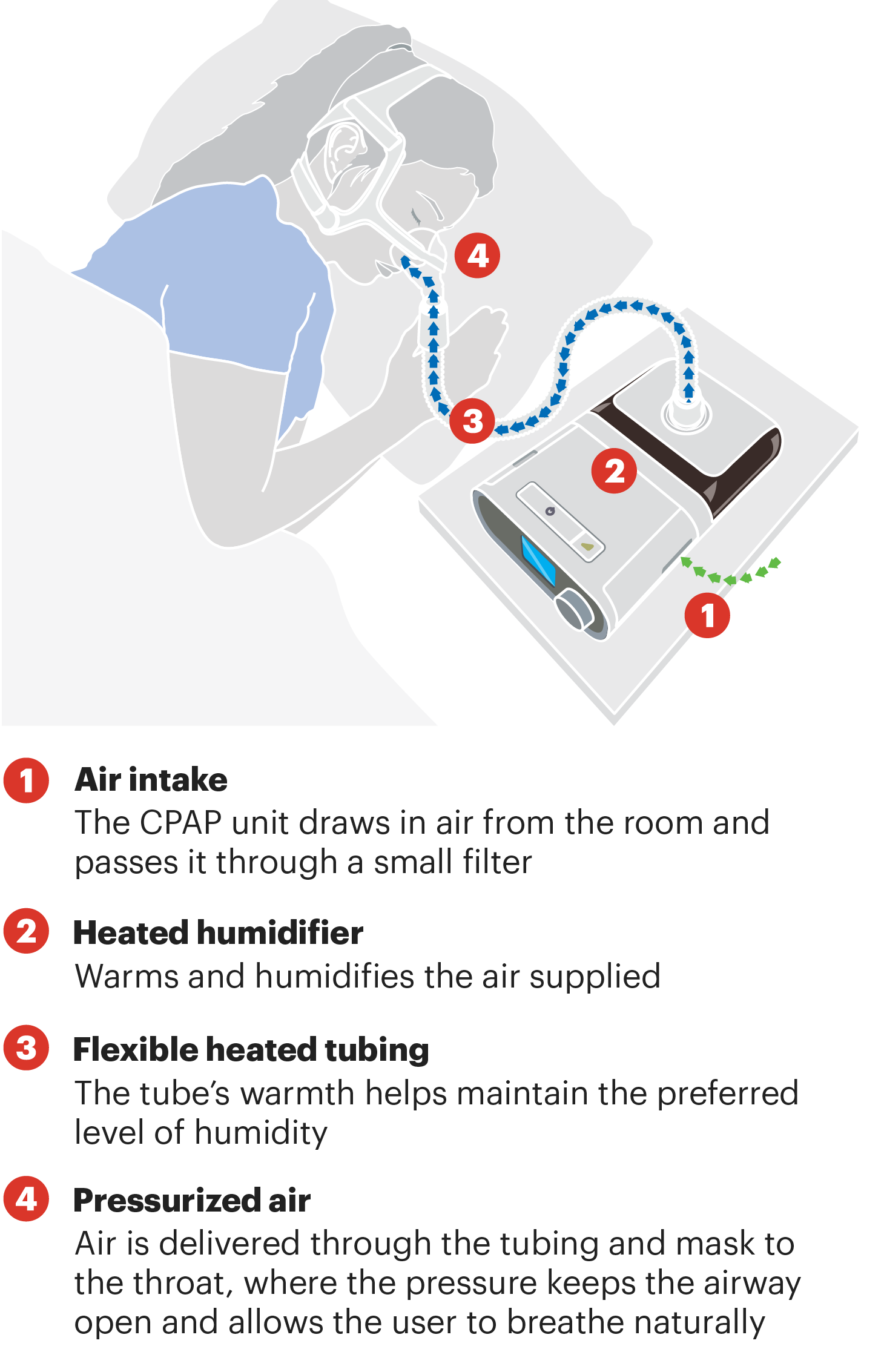 Air is delivered through the tubing and mask to the throat, where the pressure keeps the airway open and allows the user to breathe naturally
