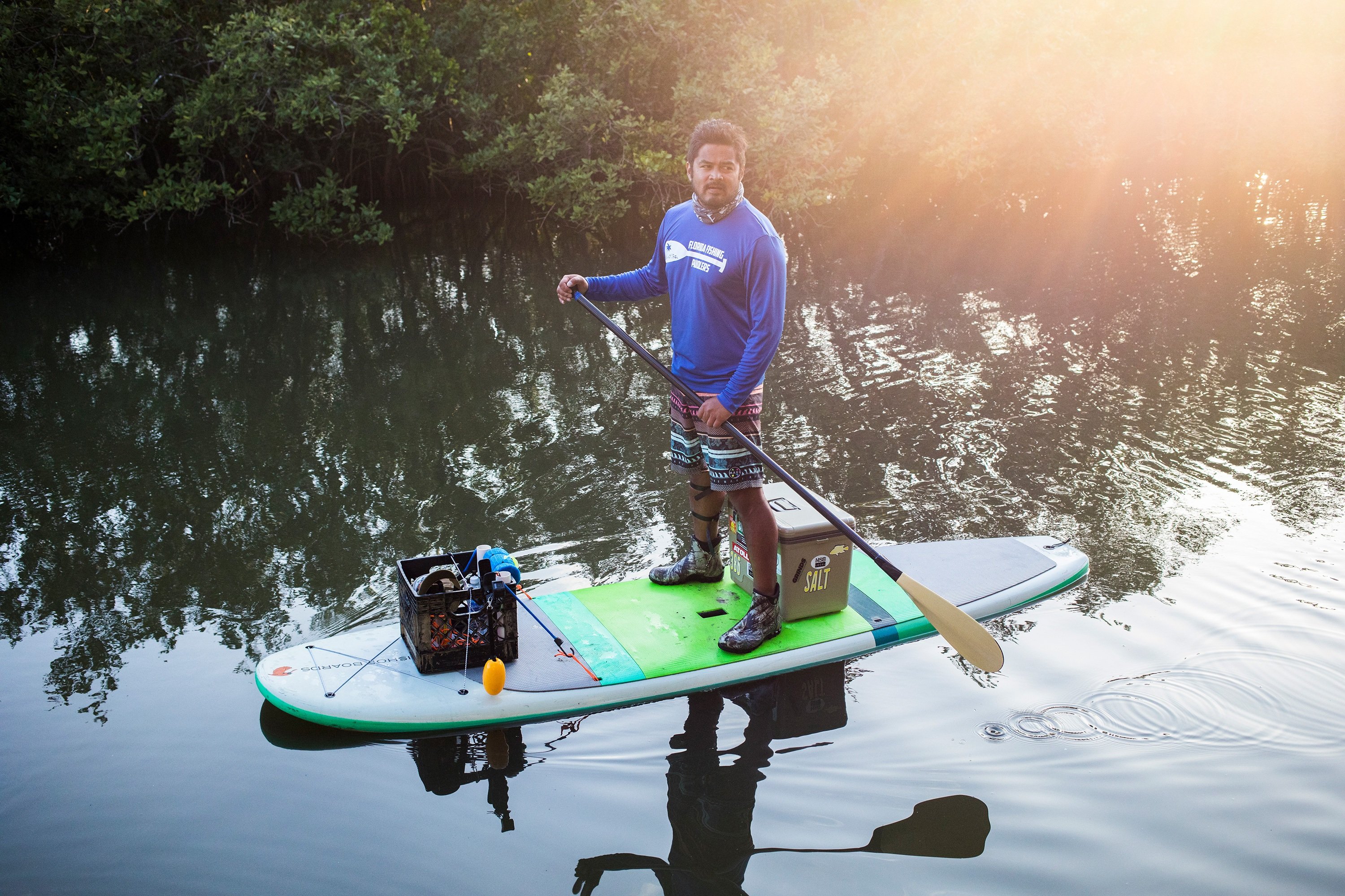 To cope, Gerry Realin goes out paddleboarding and fishing. Walking ankle deep in saltwater in Webster Creek, north of Mosquito Lagoon and the Canaveral National Seashore, Realin casts out into the channel with a lure, hoping to catch redfish, jack and trout.