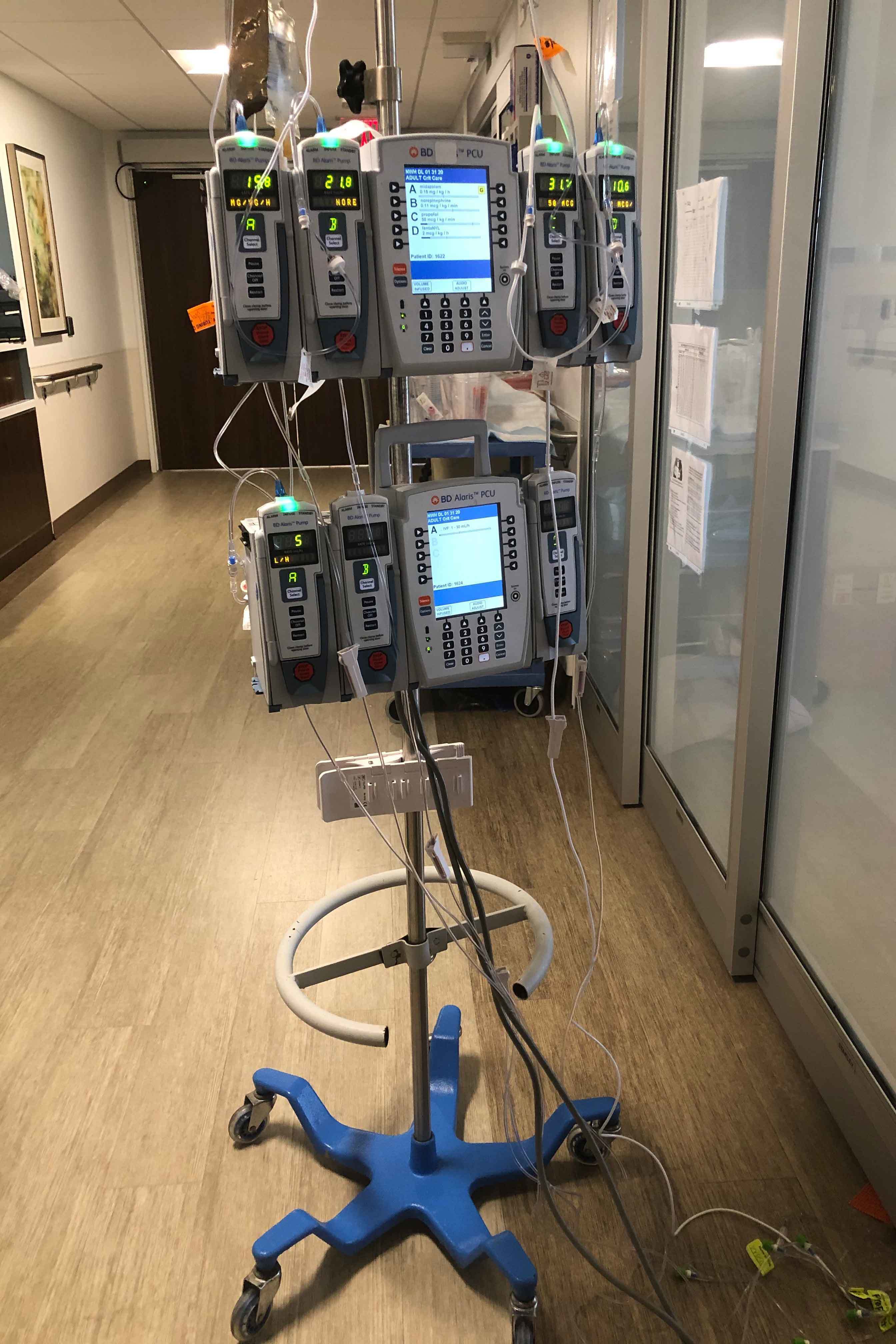 Even in units where it’s easy to check patients’ vitals without entering their room, infrequent contact can mean other important changes fall through the cracks. For patients on ventilators, nurses must manage several crucial medications, and without frequent contact, it can take too long to realize that an IV bag needs to be replaced. The IV pumps have alarms to alert staff when the bags are running low, but since patients’ doors are closed, nurses can’t always hear them.