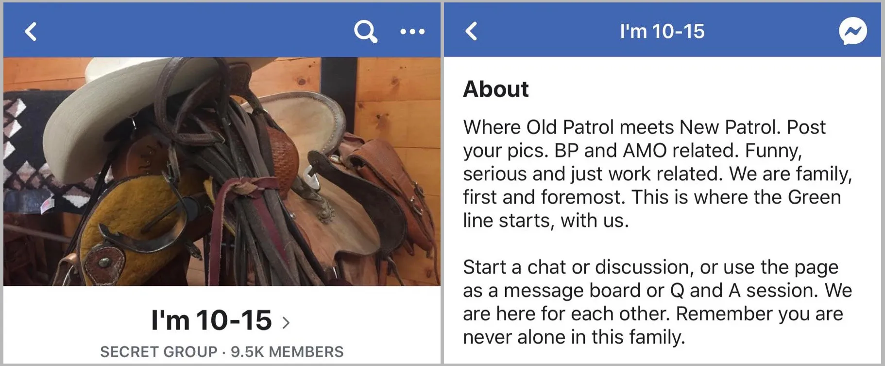 Created in August 2016, the Facebook group is called “I’m 10-15” and boasts roughly 9,500 members from across the country. (10-15 is Border Patrol code for “aliens in custody.”) The group described itself, in an online introduction, as a forum for “funny” and “serious” discussion about work with the patrol. “Remember you are never alone in this family,” the introduction said.