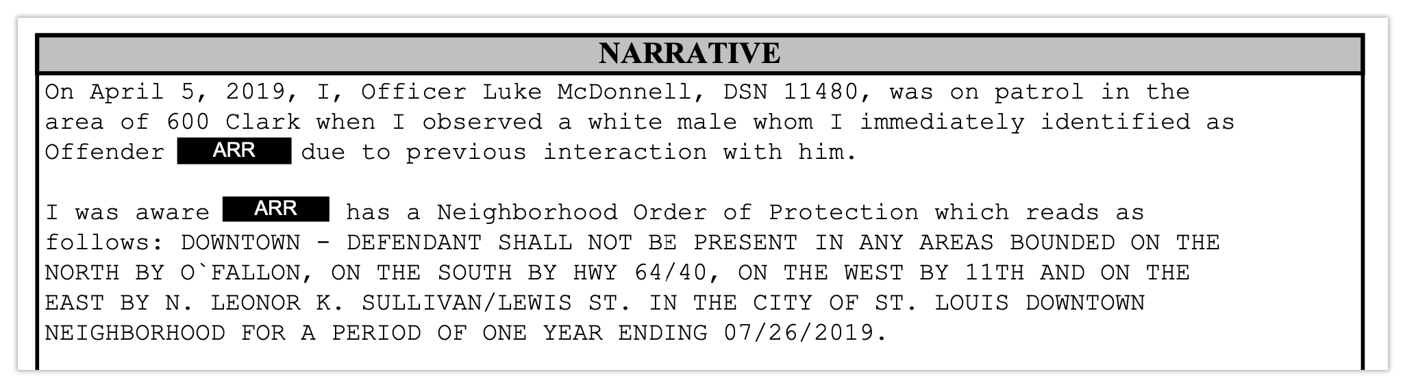 Some cases can linger for years, as police repeatedly seek and enforce neighborhood orders of protection against the same people with little evidence that the orders are effective. In a report in 2017, a St. Louis police officer wrote that he was working for the department’s downtown bike unit and trying to combat a “rise in quality of life violations” downtown. He said a motorist complained about homeless people outside the city’s Dome, where the NFL’s Rams used to play.