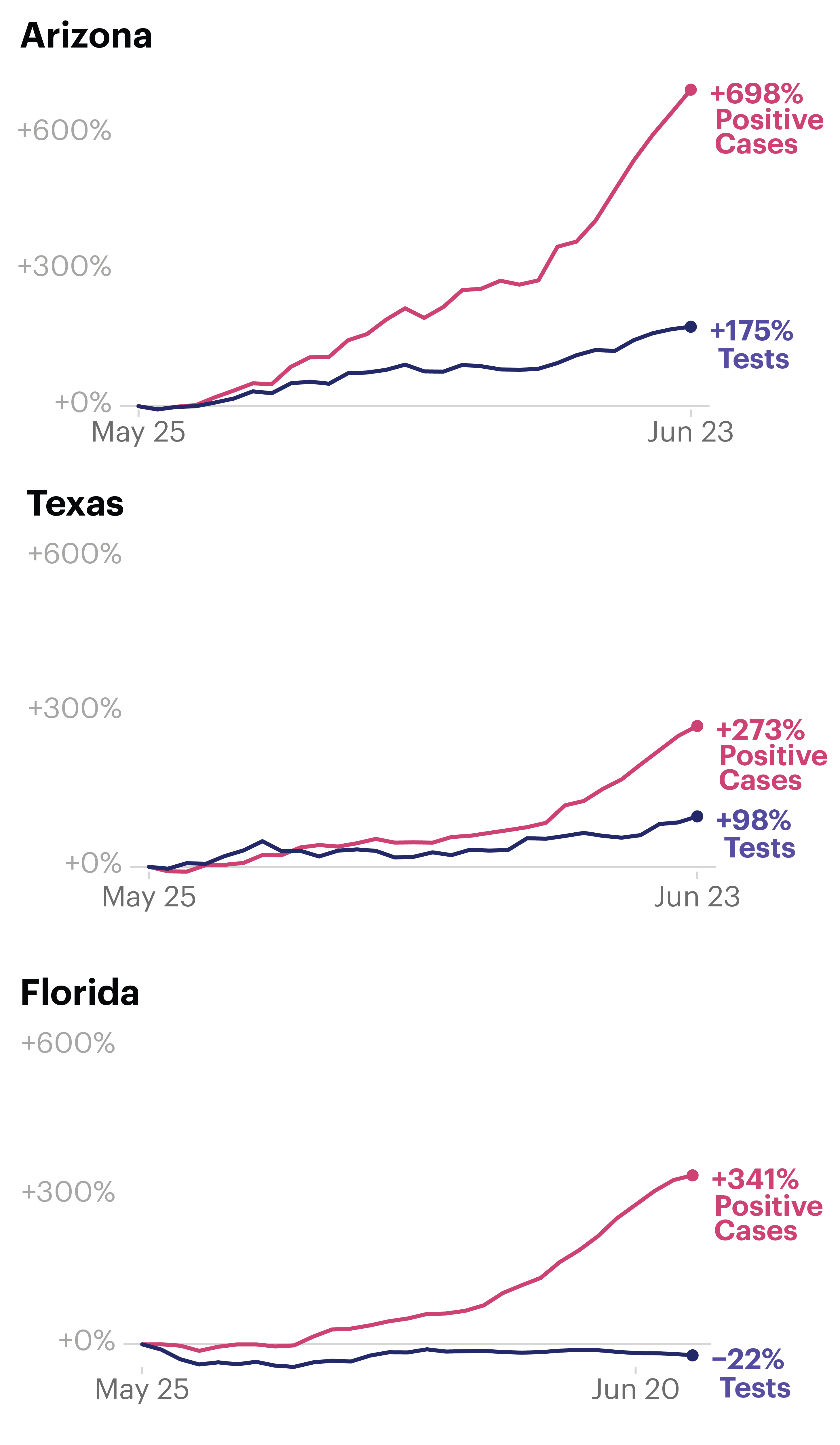 By comparison, more than 20% of tests are coming back positive in Arizona; the figure has topped 10% in Texas. (View data from your state here.)