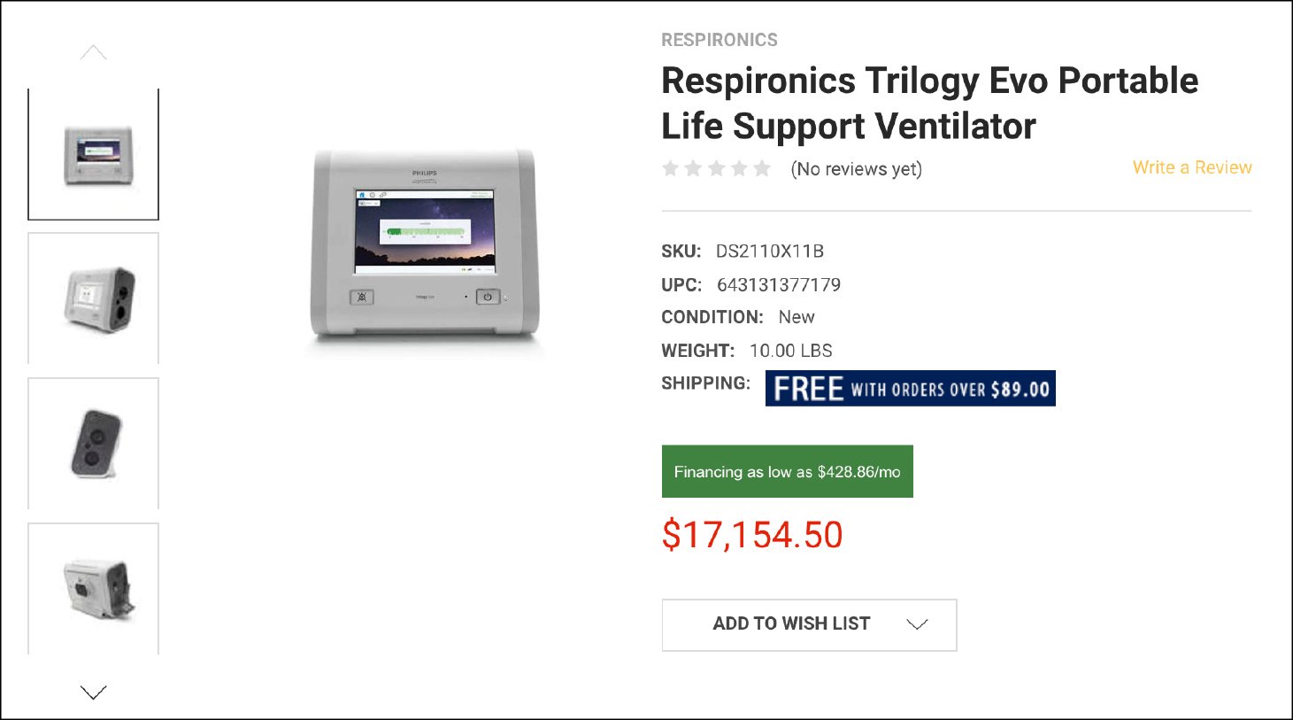 “We sell to whoever calls,” said a saleswoman at a small medical-supply company on Staten Island that bought 50 Trilogy Evo ventilators from Philips in early March and last week hiked its online price from $12,495 to $17,154. “We have hundreds of orders to fill. I think America didn’t take this seriously at first, and now everyone’s frantic.”