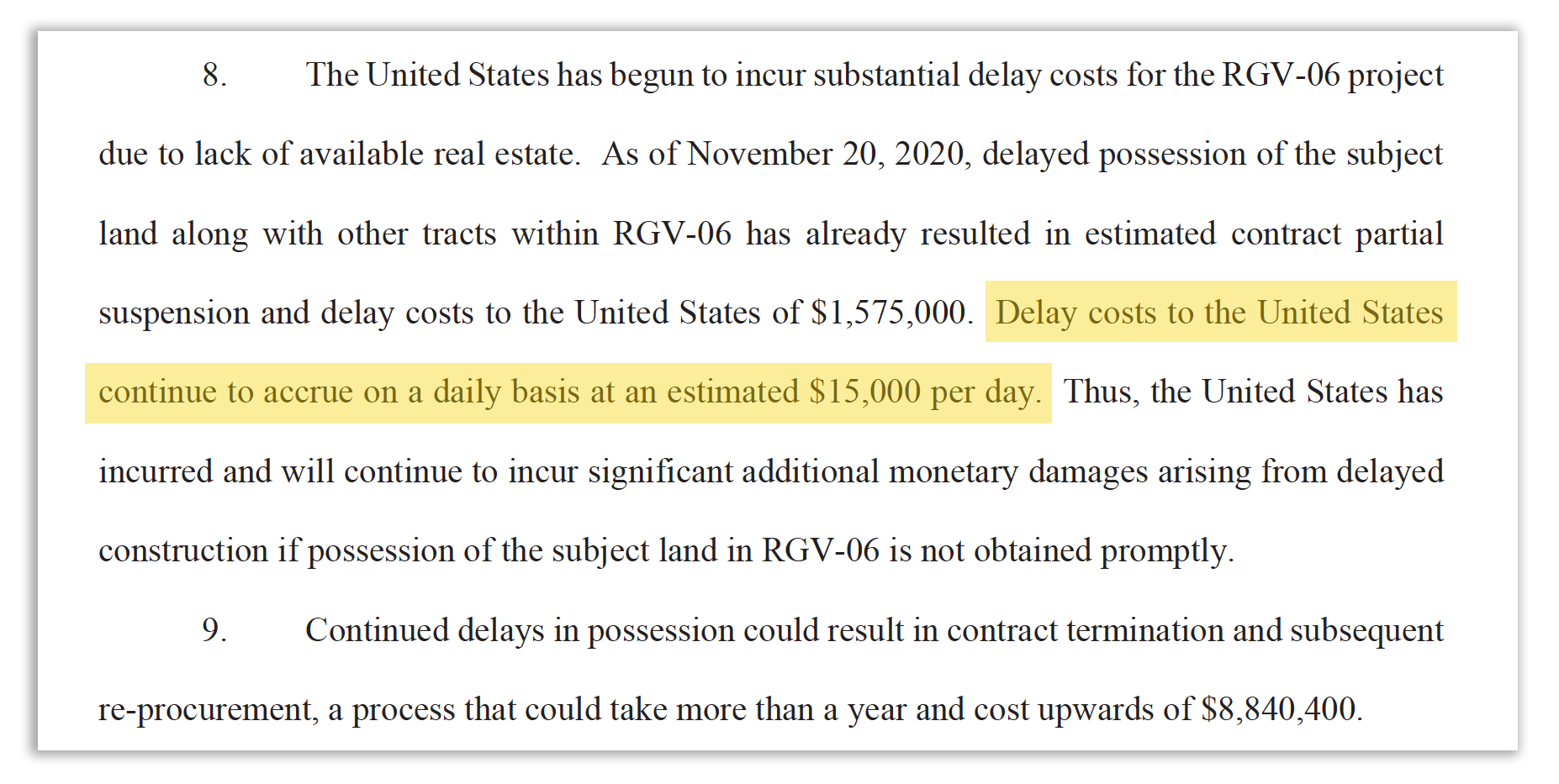 In four Rio Grande Valley projects alone, where the government has detailed the costs of delays in court filings, the total is nearly $9 million, as of the date the court granted the order for immediate possession, which is when work can begin.