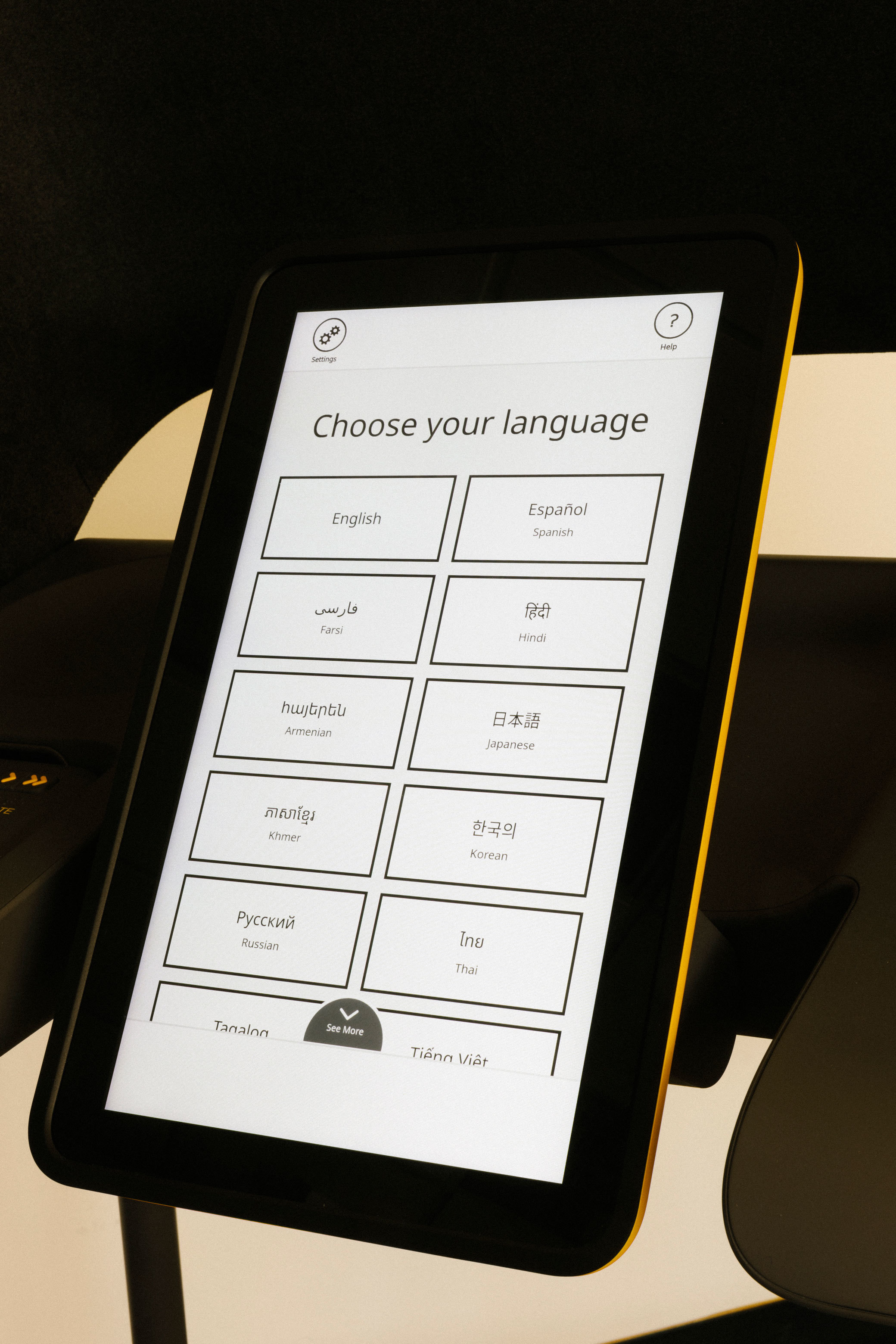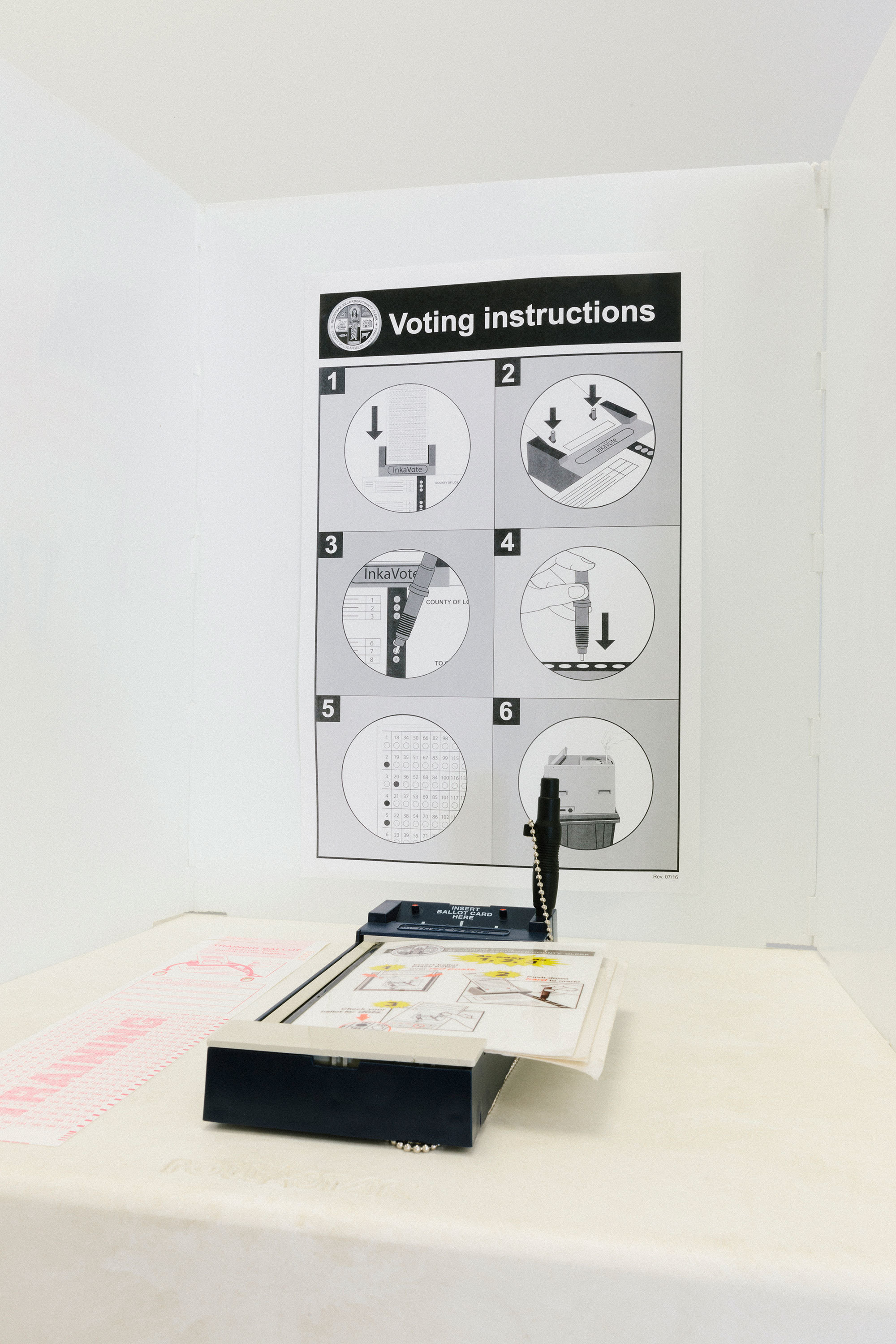 The machines had voters use a tablet perched in an artfully designed yellow privacy booth to fill in their ballots, then printed them out to be reviewed. Then, the finished ballot was sucked back in, like a dollar into a vending machine, and placed in a bin. The machines were nearly fully collapsible and made with off-the-shelf products that would allow the county to keep them updated at a low cost.