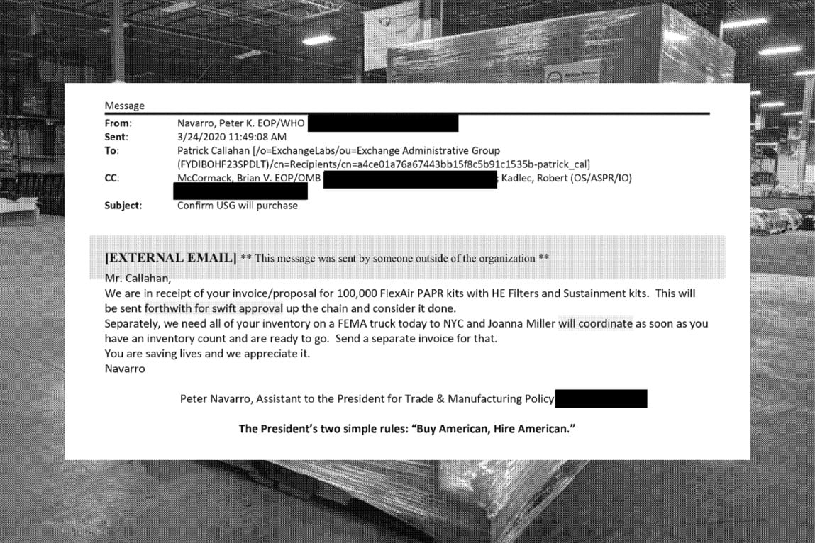 The respirator deal, with Airboss Defense Group, a subsidiary of Canadian company Airboss of America, was reported by ProPublica in April 2020 after a highly unusual entry in federal procurement data indicated the contract had been directly ordered by the White House. The Trump administration provided few answers about the award, but records the company provided to Congress indicate the firm used an influential consultant to connect Navarro with Airboss CEO Patrick Callahan.