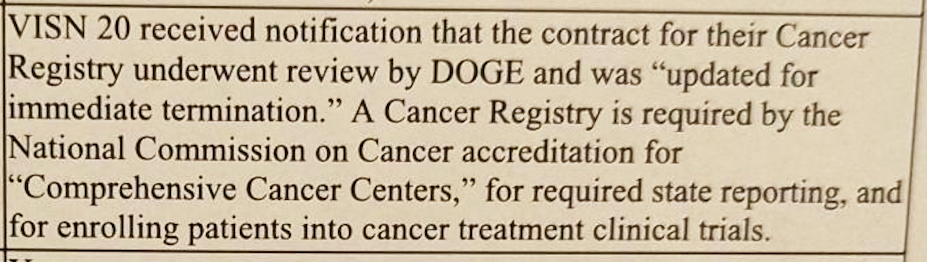 In March, VA officials across the country warned that a critical resource — databases for tracking cancer — would no longer be kept up to date. As officials in the Pacific Northwest explained, the Department of Government Efficiency was moving to kill its contract with the outside company that maintained and ran its cancer registry, where information on the treatment of patients is collected and analyzed. DOGE had marked it for “immediate termination.”
