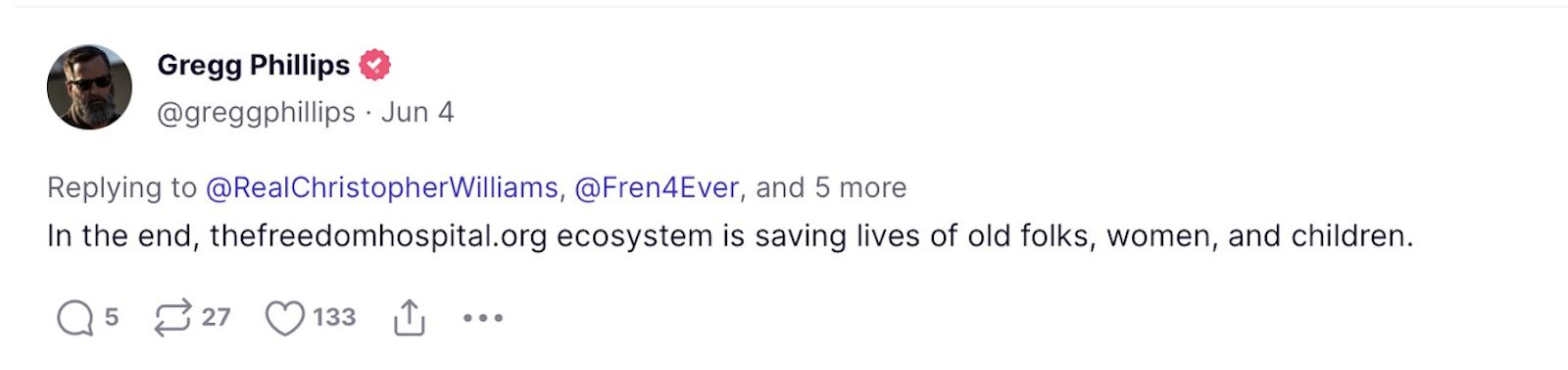 “My work and my calling is to create a private healthcare and extraction ecosystem for old folks, women and children,” he wrote in a post on June 5. “The Freedom Hospital is my commitment to God come to life.”