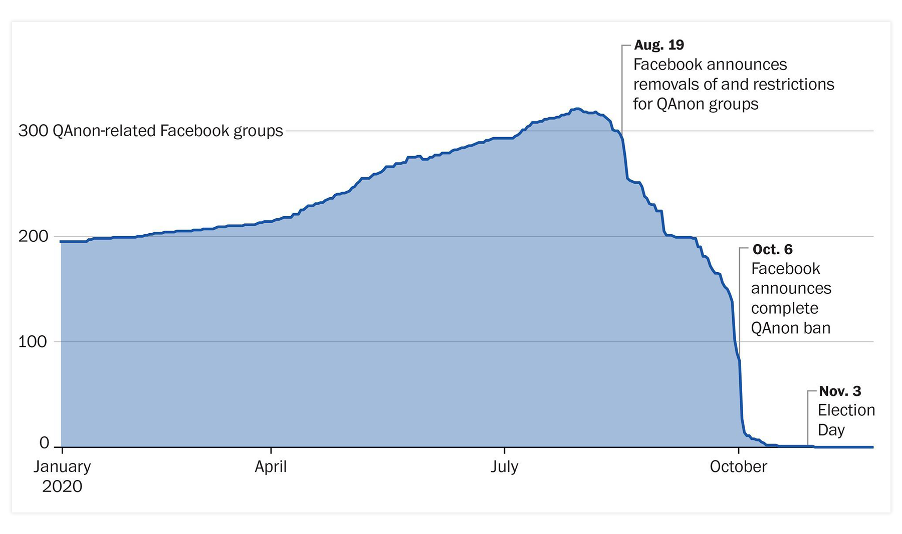 For example, reporters identified more than 300 QAnon groups in the CounterAction dataset. All had been removed by October 2020, when Facebook announced a total ban of QAnon.