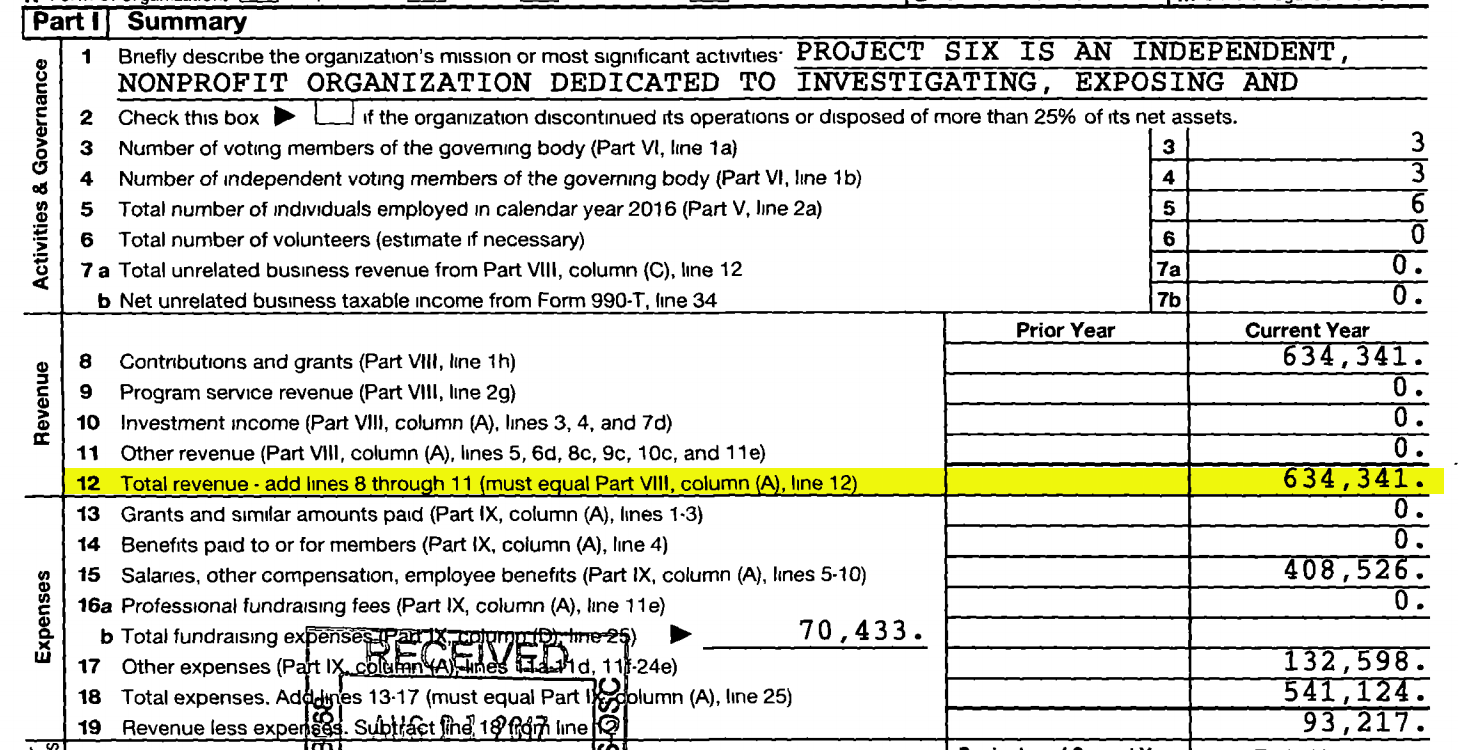 To find out how that money fit into the overall budget for Project Six, we then took a look at that group’s 2016 tax return, which you can see here.