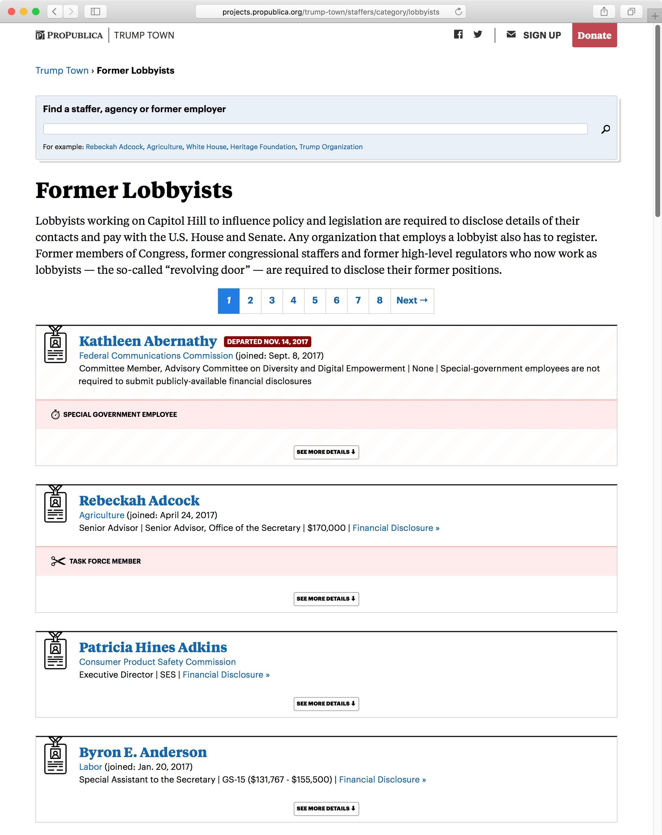Today we’re making available, for the first time, an authoritative searchable database of 2,475 political appointees, including Trump’s Cabinet, staffers in the White House and senior officials within the government, along with their federal lobbying and financial records. Trump Town is the result of a year spent filing hundreds of Freedom of Information Act requests; collecting and organizing staffing lists; and compiling, sifting through and publishing thousands of financial disclosure reports.