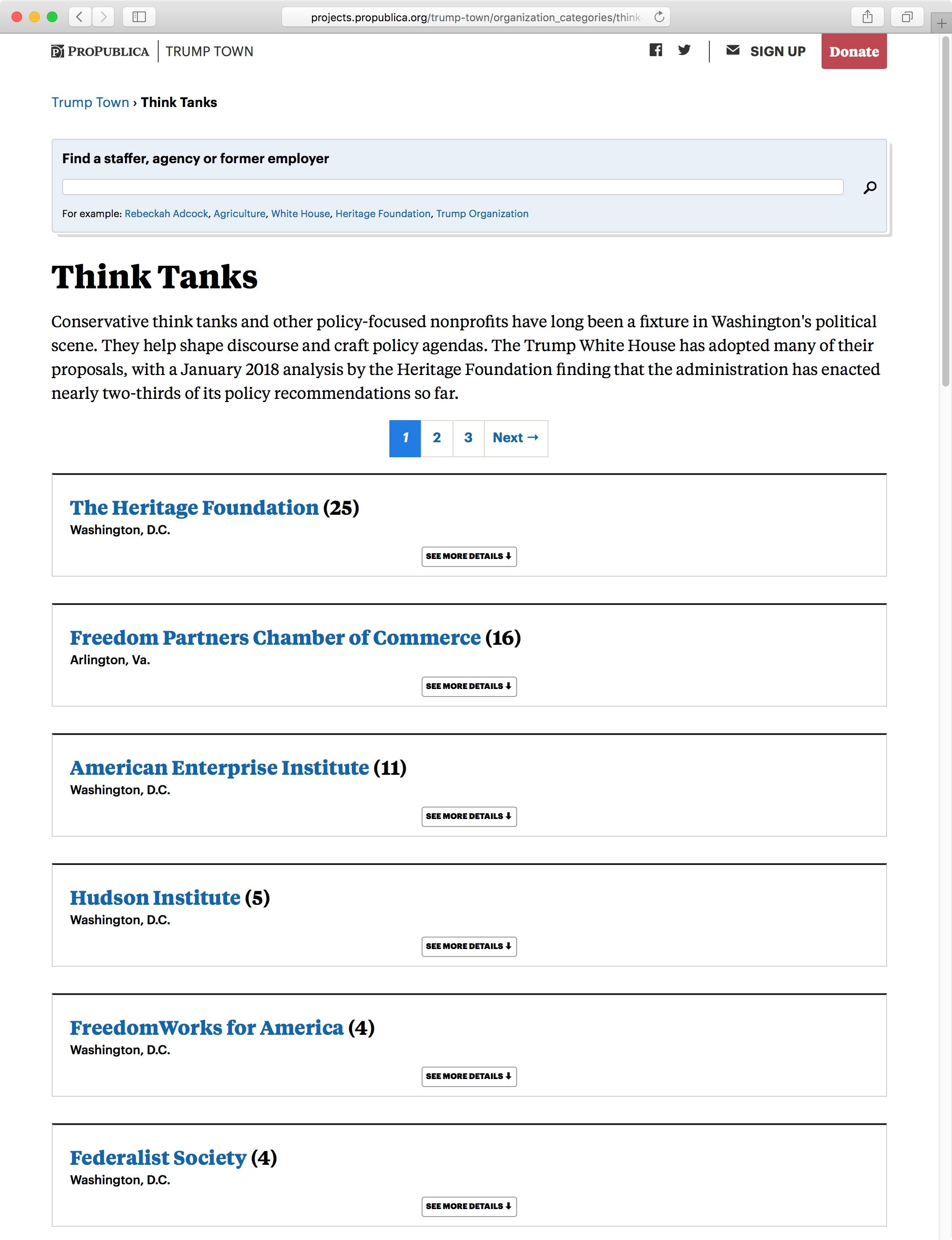 Drilling down even further, at least 35 Trump political appointees worked for or consulted with groups affiliated with the the billionaire libertarian brothers Charles and David Koch, who also have a network of advocacy groups, nonprofits, private companies and political action committees. At least 25 Trump appointees came from the influential Heritage Foundation, a conservative think tank founded in 1973, and at least two came from Heritage Action, its related political nonprofit. Heritage says the Trump administration, in just its first year, has enacted nearly two-thirds of its 334 policy recommendations.