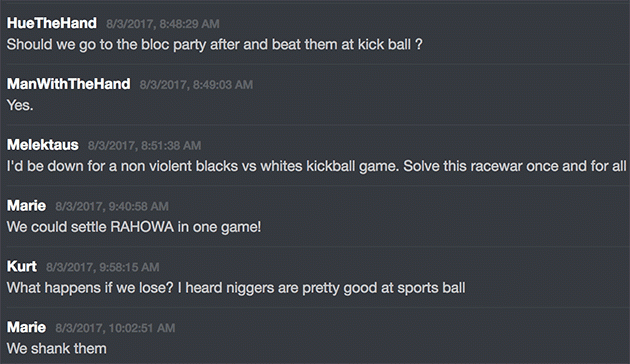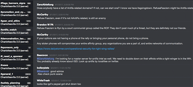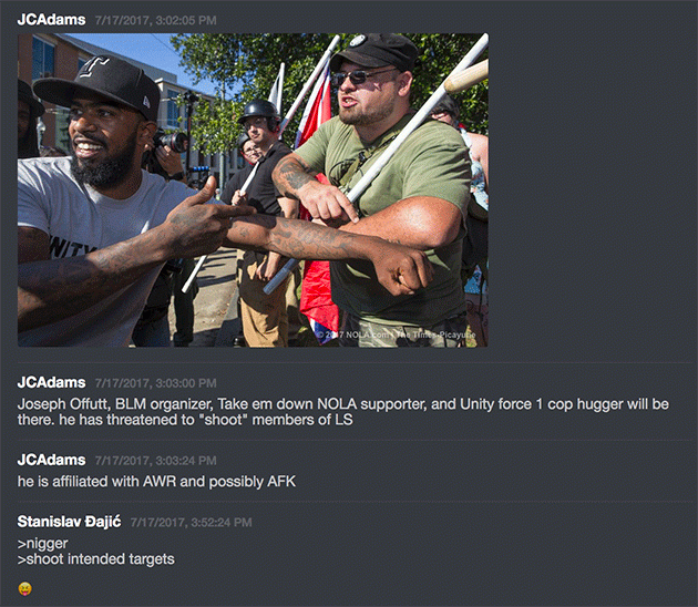 The pre-Charlottesville chats include discussions of potential violence, the use of weapons, and excitement at the prospect of “fighting for the white race.”