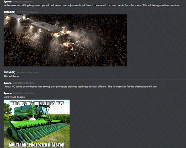 The discussion boards include repeated fantasies of violence against counter-protesters and black residents, only occasionally challenged by board moderators. (Wired.com reported on several examples over the weekend.) On July 18, for example, user AltCelt(IL) posted a photo of vehicles surrounded by crowds in response to fellow commentors’ discussion of car insurance and logistics. Another user replied, claiming that in North Carolina “driving over protesters blocking roadways isn’t an offense.” The user seemed to be referring to a controversial bill that was recently passed by the North Carolina Statehouse. The user then posted a meme showing a combine harvester that could be a “digestor” for multiple lanes of protesters, saying, “Sure would be nice.”