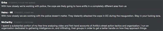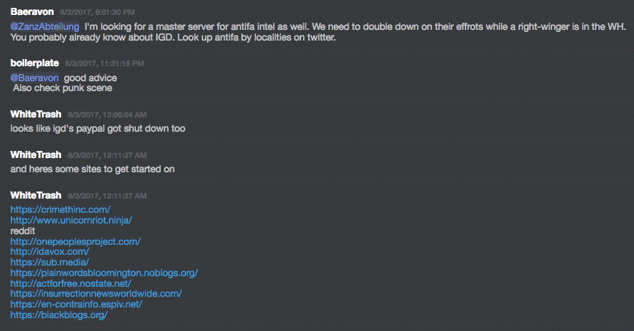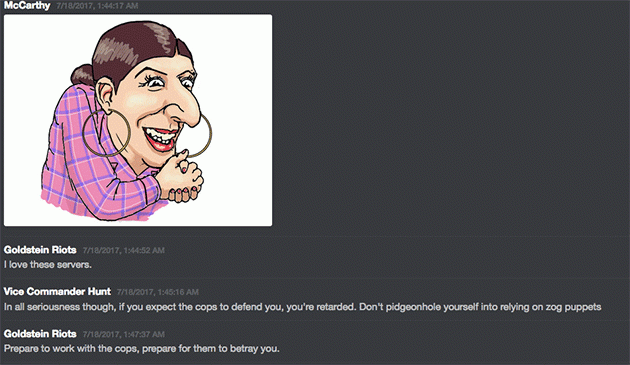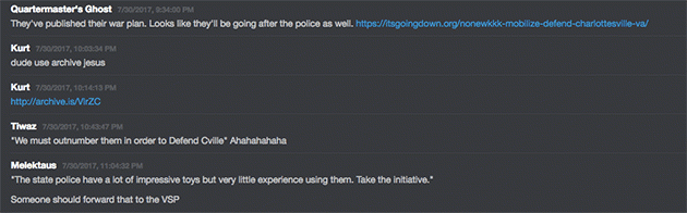 In another post, this one on July 30, a user noted that an anarchist blog post discussing the Charlottesville rally should be forwarded to the Virginia State Police. Eli Mosley, who played a lead role in organizing the “Unite the Right” rally, told ProPublica via Twitter that police had been informed about “potential threats” his group had received. (The Virginia State Police and the Charlottesville Police Department did not respond to ProPublica’s inquiries as to whether they received any such content.)