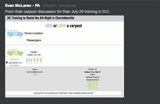 McLaren, for instance, posted information about a “DC Training to Resist the Alt-Right” car pool, which he took from the discussion section of a left-wing Facebook event. (McLaren said he did so to protect his fellow marchers.)