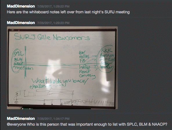 The white supremacists also gathered and shared information they had gleaned via in-person sleuthing efforts. One post from July 26, for example, showed a photo a white supremacist took of notes left on a whiteboard from a meeting of a group called Showing Up For Racial Justice in Charlottesville. The board included references to the Southern Poverty Law Center, Black Lives Matter and other entities.