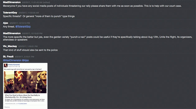 Weeks before the “Unite the Right” rally, chat-room participants were collecting alleged left-wing threats of violence, such as “Punch a Nazi” posts on social media, suggesting this content should be forwarded to police or compiled for court proceedings. In one post from Aug. 9, for example, a user advised members of the “Antifa Watch” discussion thread to share threats against the rally “to help with our court case.”