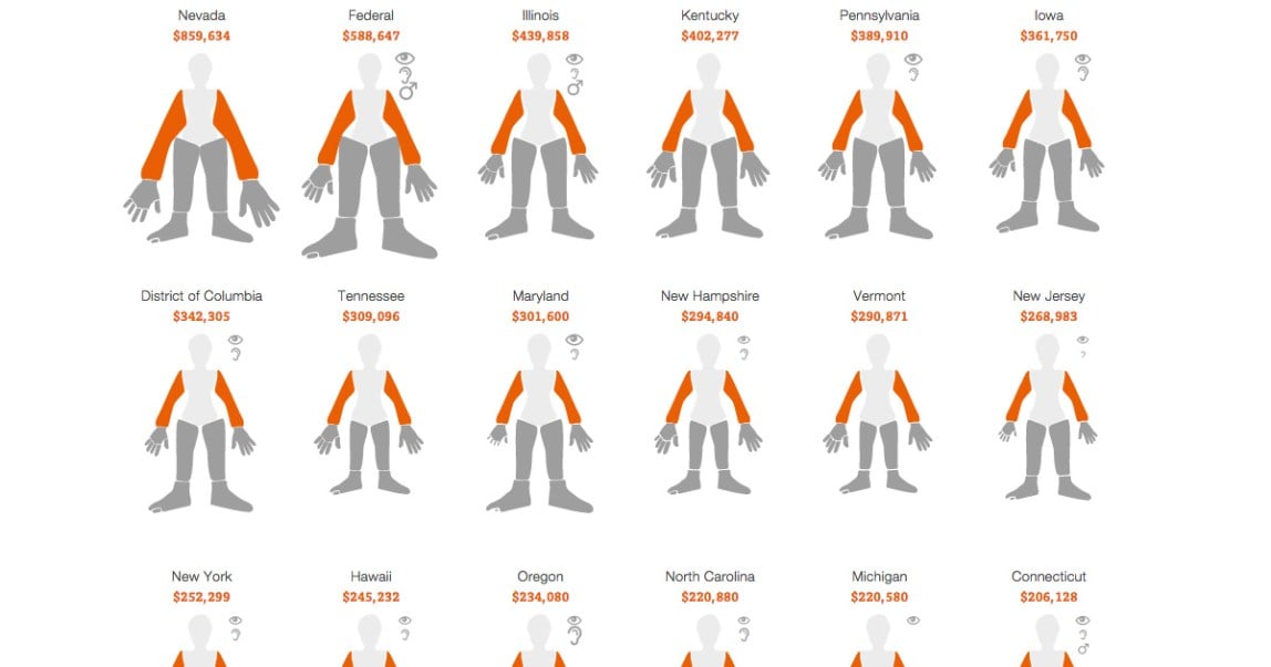 For the interactive graphic Workers’ Comp Benefits: How Much is a Limb Worth? ProPublica researched laws for all 50 states, the District of Columbia and the Federal Employees’ Compensation Act to calculate the maximum benefit injured workers can receive for the total loss or amputation of various body parts. Researchers then checked their calculations with state officials, attorneys and judges in those states. The benefit, often known as “permanent partial disability,” is in addition to temporary wage-replacement benefits and is intended to compensate workers who’ve suffered severe injuries, but can still work in some capacity. (Note: Permanent partial disability is only one part of a larger system and states may be more or less generous in other aspects.) Because these are usually the maximums, most injured workers receive less.