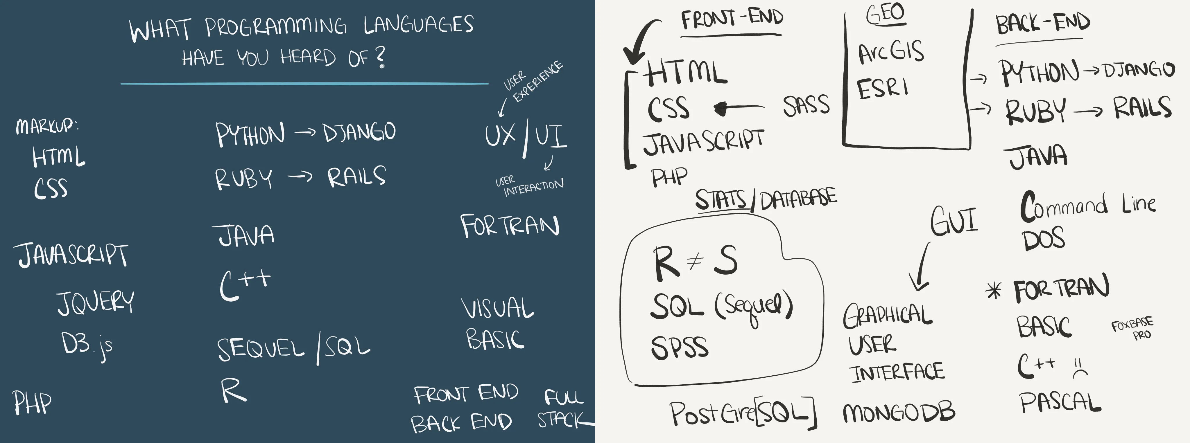 Once I know we’ve collected terms from all the major areas: “front-end,” “back-end,” “databases,” “mapping,” “frameworks,” and whatever else the students have come up with, we usually end up with something like this: