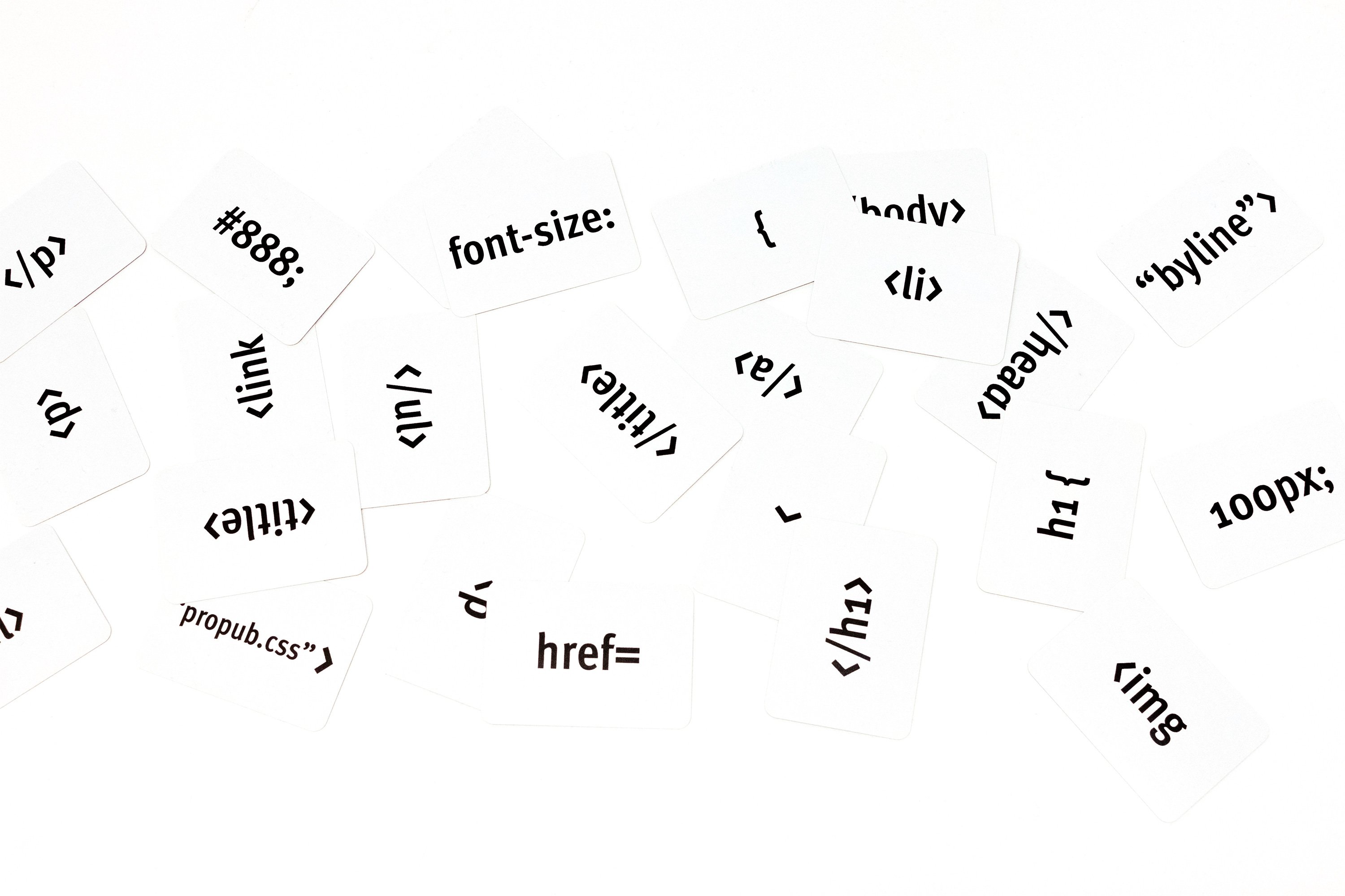 In groups of two or four, students are given a deck of mini playing cards. Each card has a little snippet of HTML or CSS on it, such as <img> or </p> and on a large table or desk (or the floor) students are asked to organize the cards so that the code would create a functional website. Every single card must be used and while some cards must go in the same order no matter what, others are more flexible, and students can get creative about the “website” they’re creating.