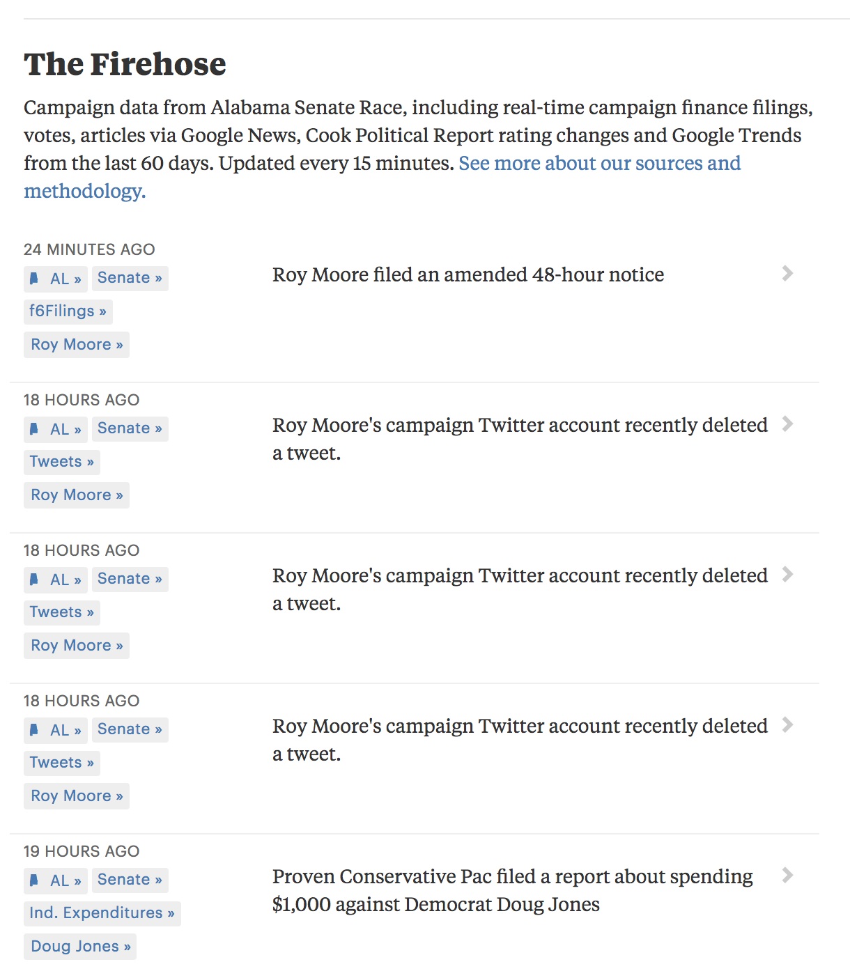 That means an even richer stream of data about high-profile contests such as the Nevada Senate race or the special Senate election in Alabama on Dec. 12. Election DataBot has a page for each race showing the most recent activity, meaning that reporters quickly can track super PACs spending money to support or oppose a candidate and delve more deeply into Roy Moore’s or Doug Jones’ pages or click on an item to see the FEC filing for each expenditure. Or you can search for a committee such as the Proven Conservative PAC, which backs Moore, and sign up for an alert each time Election DataBot gets updated information about its activities.