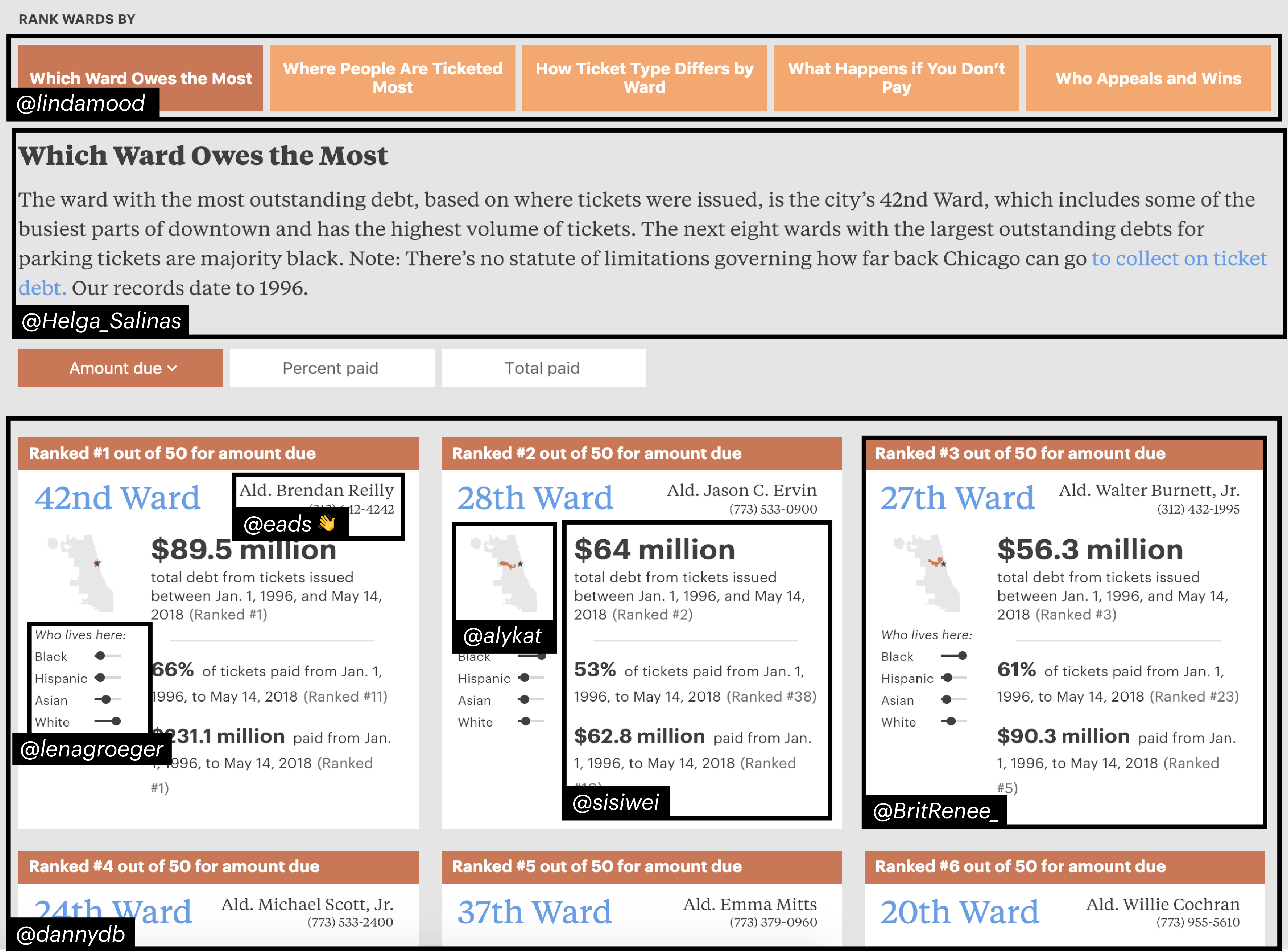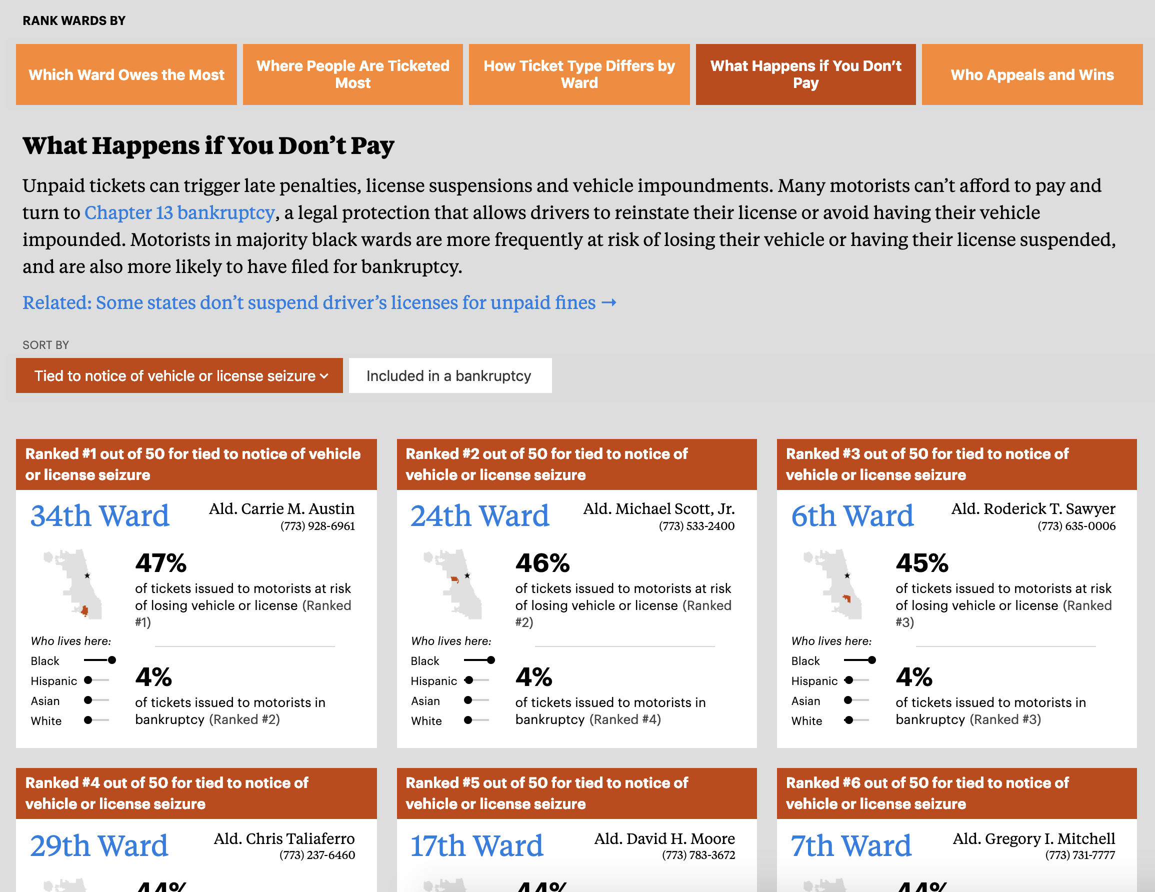 So when we thought about building an interactive database that allows the public, for the first time, to see all 54 million tickets issued over the last two decades, we wanted to make sure users understood the findings of the overall project. That’s why we centered the user experience around the disparities in the system, such as which wards have the most ticket debt and which have been hit hardest because residents can’t pay.