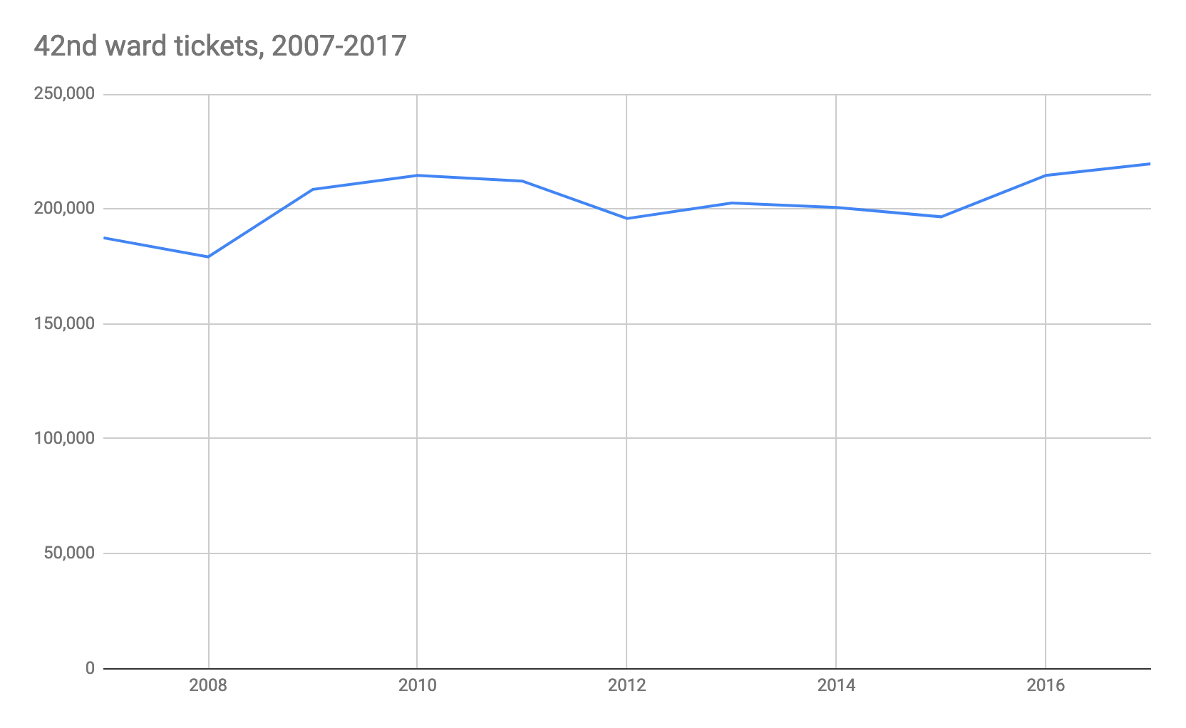 For example, here’s the trend over time for tickets in the 42nd Ward (downtown Chicago). It’s not very revealing. Is there an upward trend? Maybe a little. But the chart says little about the overall effect of tickets on people’s lives, which is what we were really after.