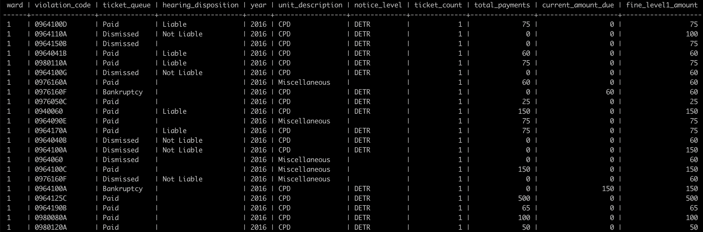 Let’s take a look at an example. The query below groups by year and ward, along with several other key variables such as violation code. By grouping this way, we can easily ask questions like, “How many parking meter tickets were issued in the 3rd Ward in 2005?” Here’s what the summary query looks like: