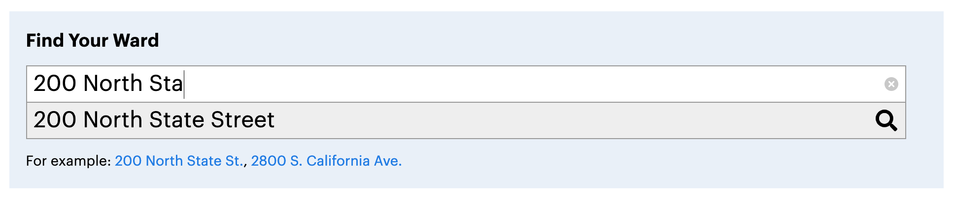 Because we were building a site with static pages and no server runtime, we had to solve the problem of offering a truly dynamic search feature. We needed to provide a way for people to type in an address and find out which ward that address is in. Lots of people don’t know their own wards or aldermen. But even when they do, there’s a decent chance they wouldn’t know the ward for a ticket they received elsewhere in the city.